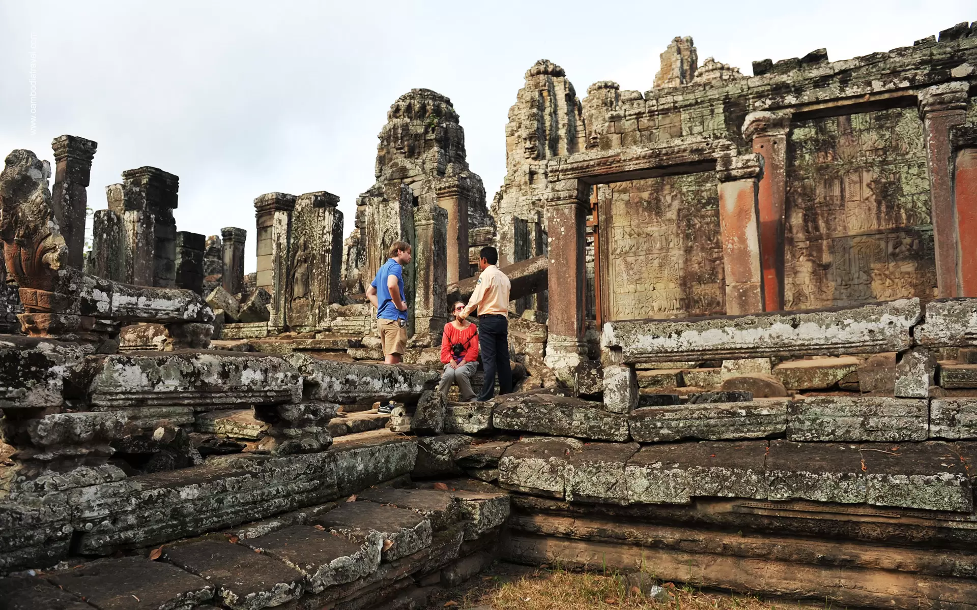 Spend the day exploring the Angkor Temple complex, including Angkor Thom with the Bayon Temple, Elephant Terrace, and Leper King Terrace. After lunch, visit Ta Prohm, known for its tree-covered ruins, and the lesser-visited Prasat Kravan and Srah Srang lake.