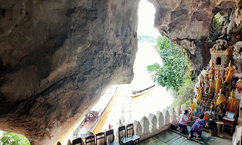 Optionally rise early to participate in the Alms Giving ceremony, a unique Buddhist tradition in Laos. After breakfast, visit the Phousi Market to see local food and products. Journey to Khouangsi Waterfall, where you can swim in the turquoise pools, walk the forest trails, and visit the Bear Sanctuary. Enjoy a picnic lunch by the falls. Return to Luang Prabang and embark on a scenic boat cruise on the Mekong River to Pak Ou Caves, known for their thousands of gold lacquered Buddha statues. Optional visit to Ban Phanom, famous for hand weaving, or return to the hotel for relaxation.