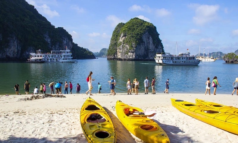 Embark on a cruise from Tuan Chau and receive a safety briefing. Enjoy lunch on board while cruising through Halong Bay and Lan Ha Bay. Spend time at Three Peaches Beach (Ba Trai Dao) for swimming and recreational activities. Back on board, join a cooking demonstration, enjoy Happy Hour with “Buy One Get One Free” drinks, and savor a five-elements signature dinner. Relax at the Lan Ha bar or try squid fishing from the main deck. The boat will anchor for the night in a tranquil spot.